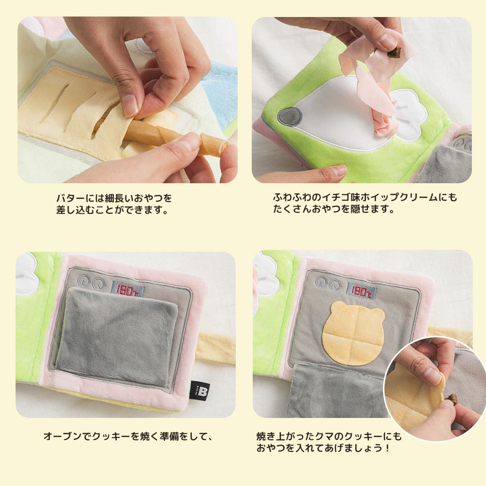 本の中にはたくさんのノーズワークページが入っています。ノーズワークはもちろんピーピー音、カシャカシャ音まで色々な楽しみ方ができて長く使えるおもちゃとなっています。